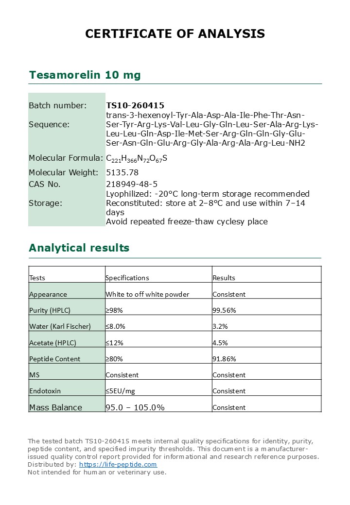 Tesamorelin is a synthetic growth hormone–releasing hormone (GHRH) analogue supplied in lyophilized powder form for laboratory and analytical research applications. It is commonly used in research settings to study pulsatile growth hormone signaling and downstream endocrine pathways.