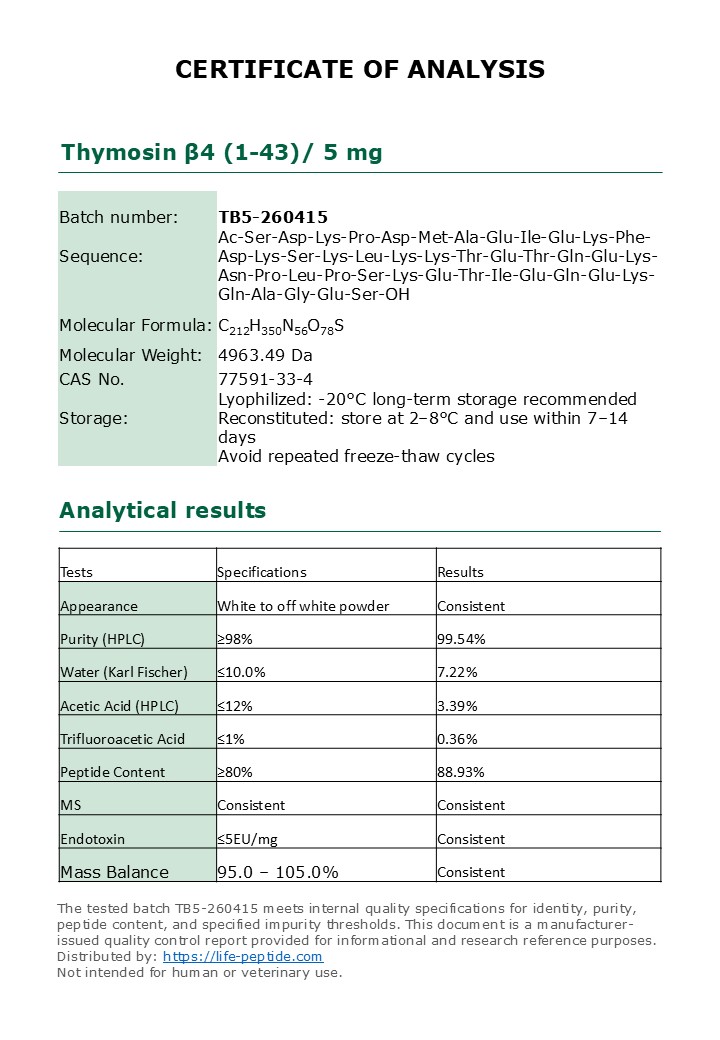 This product represents the full sequence (1–43 amino acids), in contrast to commonly marketed fragments such as TB-500. Full-length Tb4 (43 amino acids) is structurally distinct from shorter fragments and is studied for its role in actin regulation and cellular repair mechanisms.